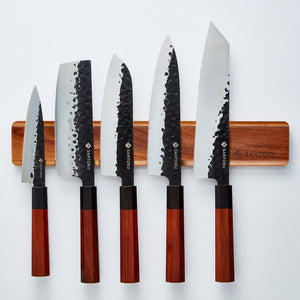 - Facas disponíveis: Petty de 5,6 polegadas, Nakiri de 6,7 polegadas, Santoku de 7 polegadas, chef de 8 polegadas e Kiritsuke de 9 polegadas.